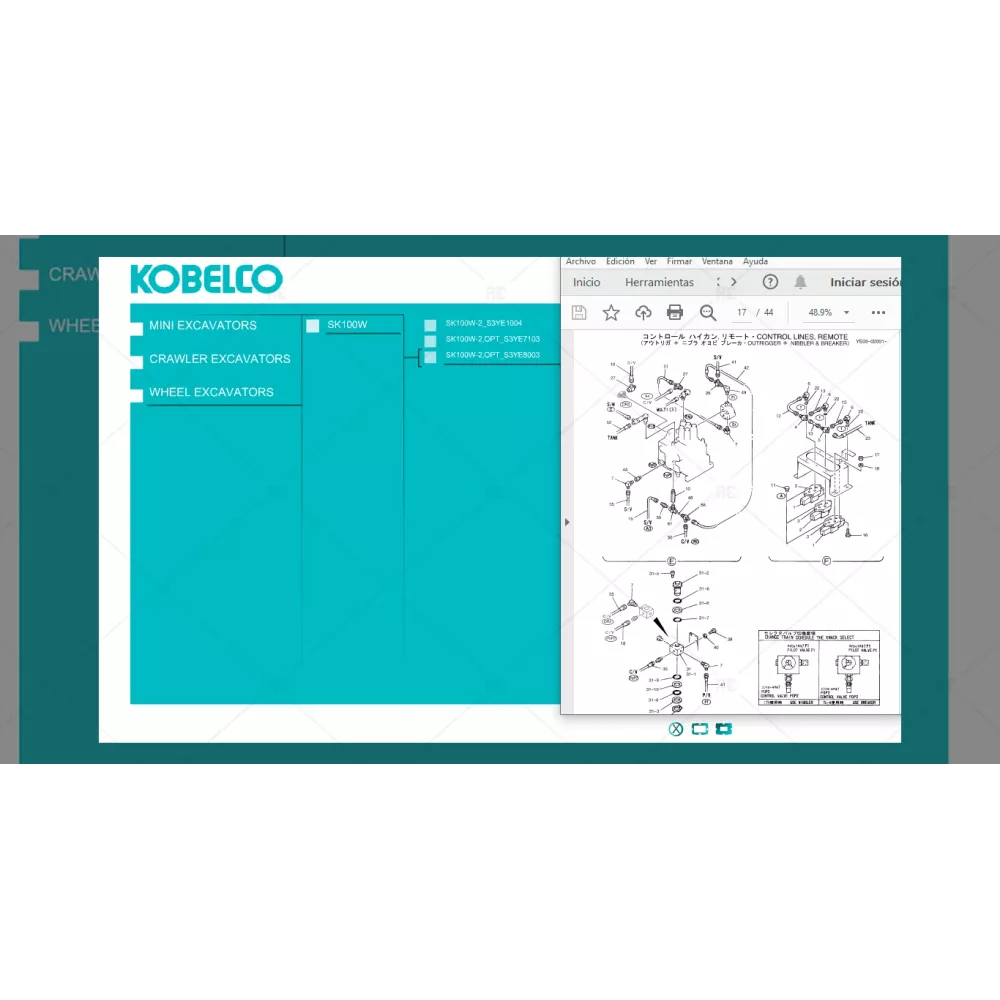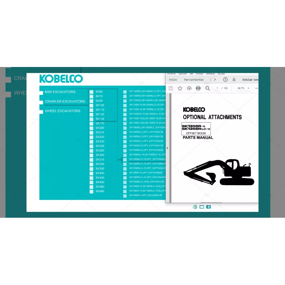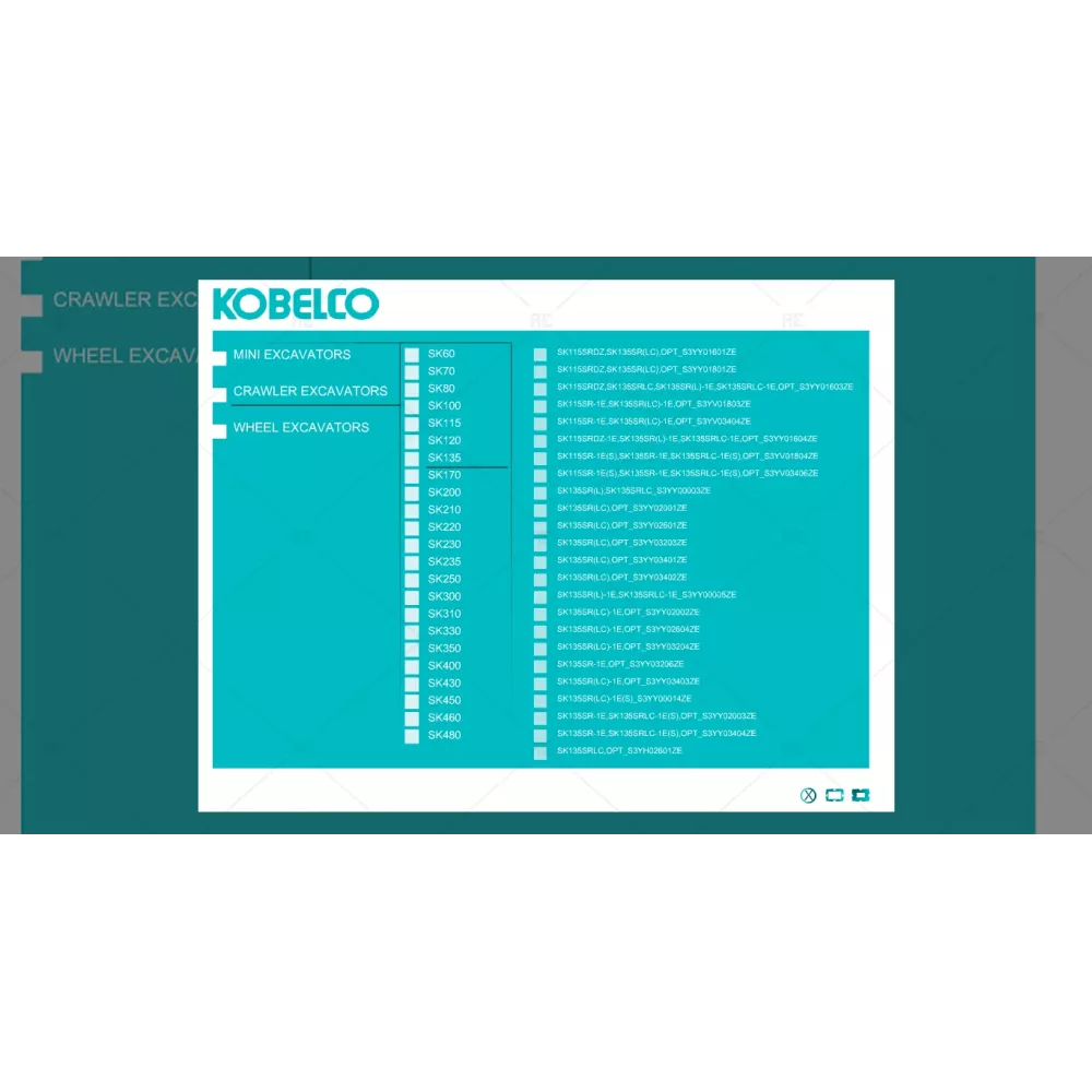 Electronic spare parts identification catalog for Kobelco heavy equipment (crawler excavators, loading curtains, wheel loaders), kobelco light equipment (mini crawler excavators) and engines.