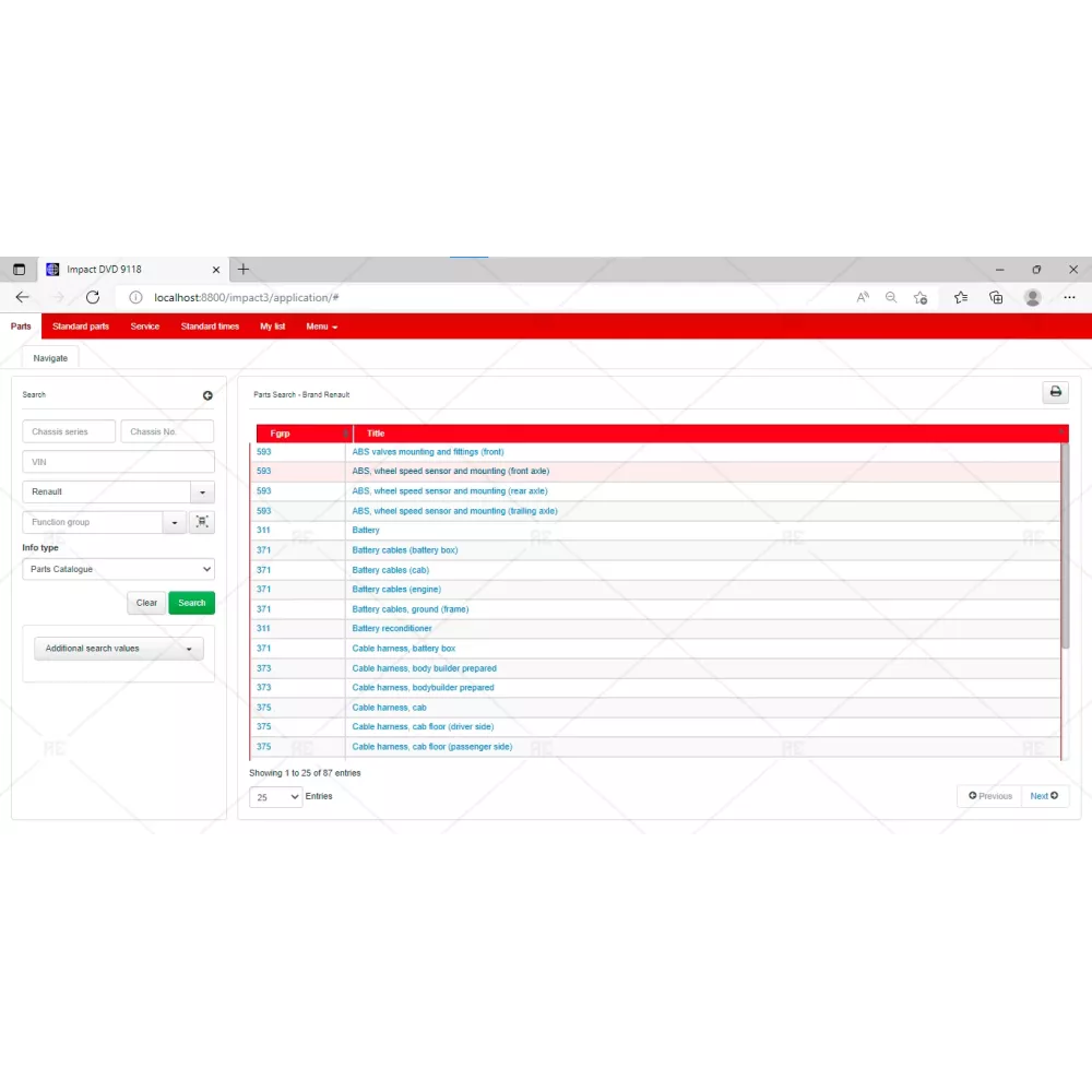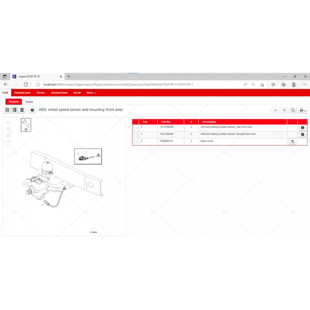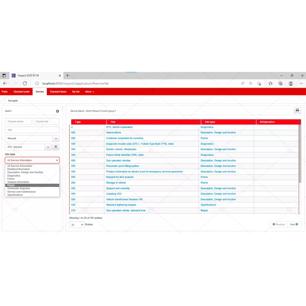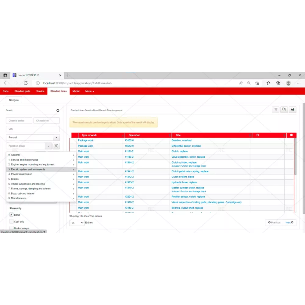 This renault impact is a web-based system that supports the workshops with information about parts, components, standard parts, services, standard time, and tools.