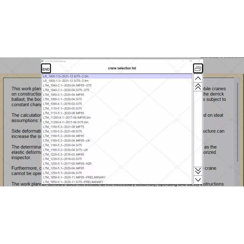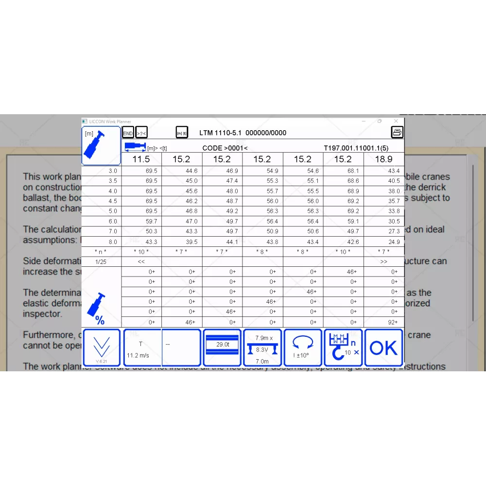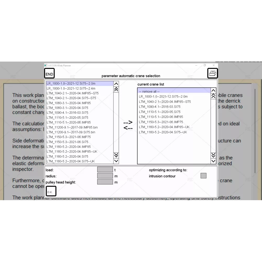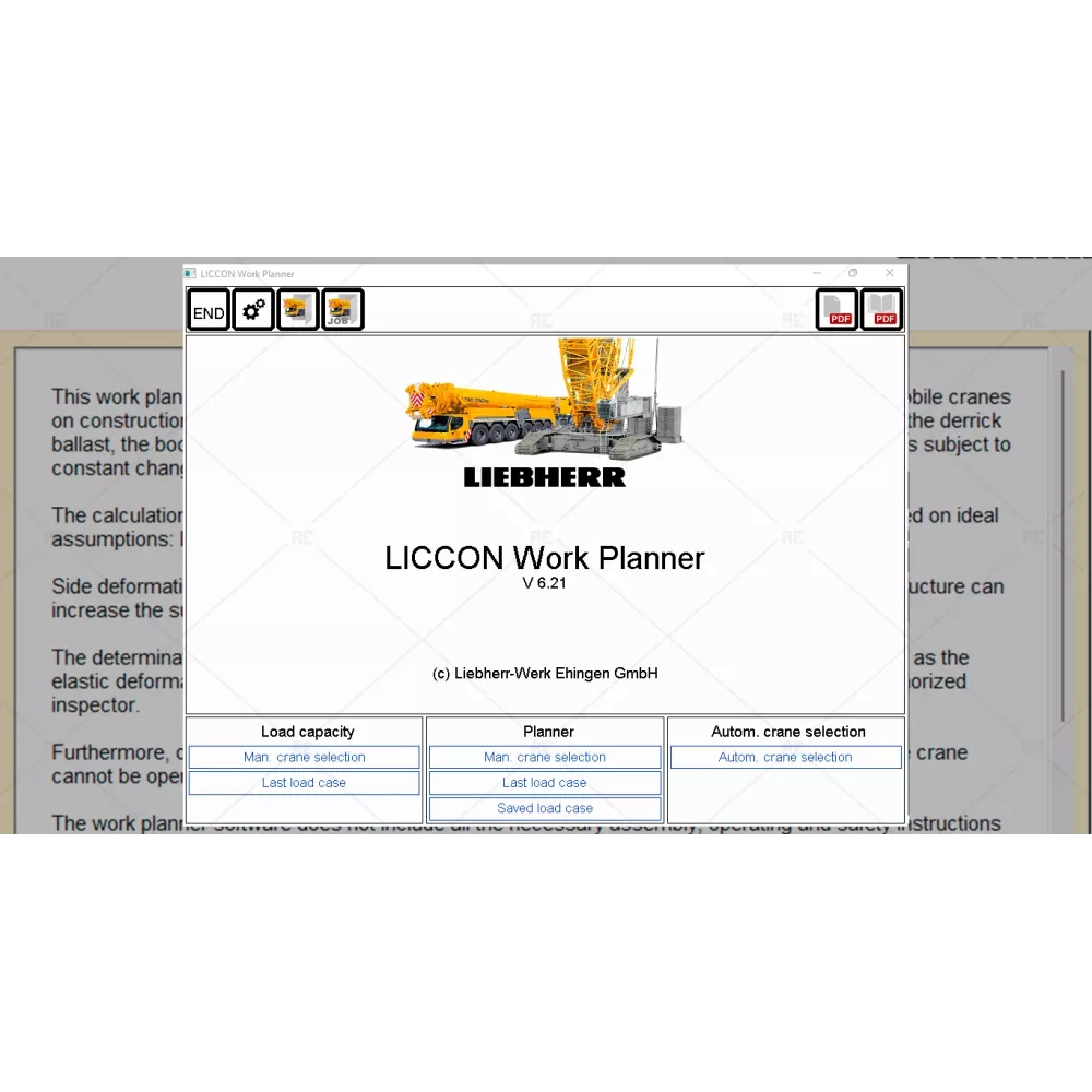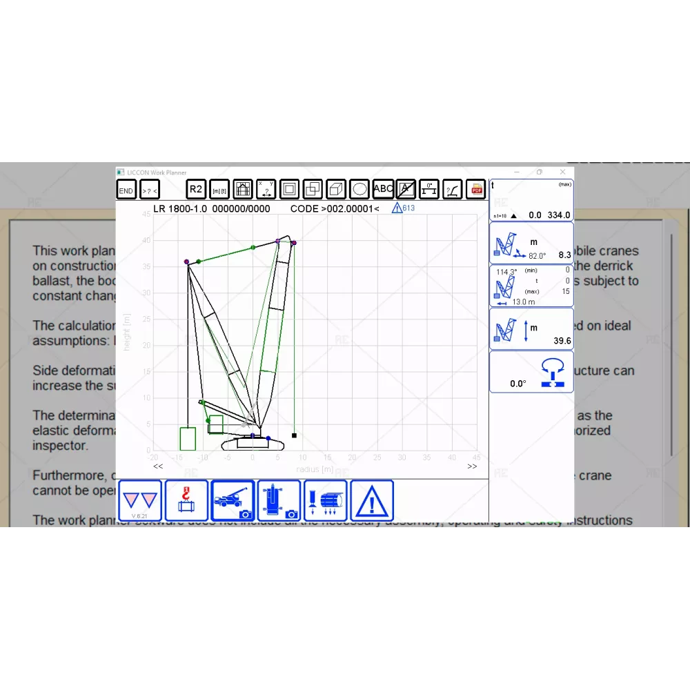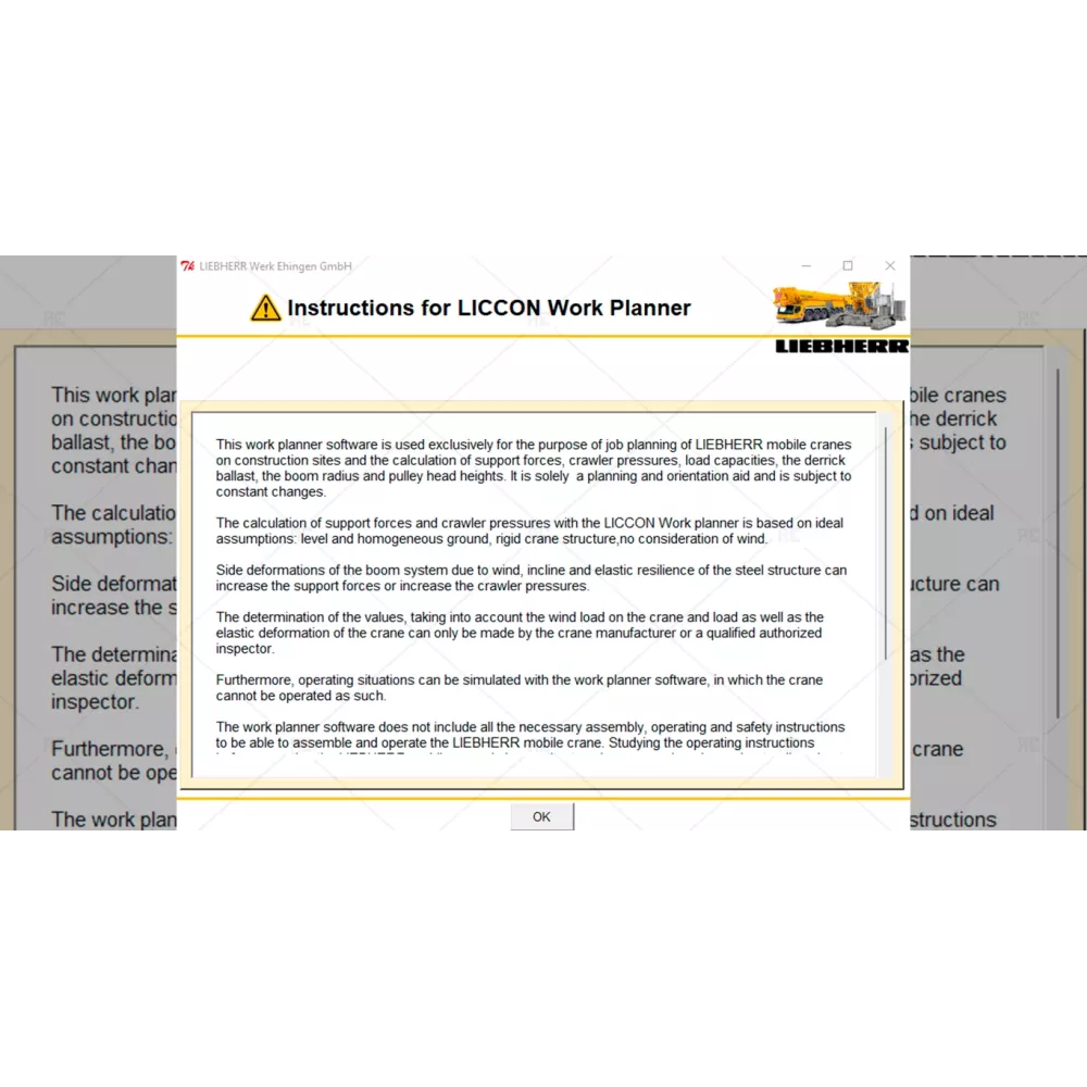 This work planner software is used exclusively for the purpose of job planning of liebherr mobile cranes on construction sites and the calculation of support forcves, crawler pressures, load capacities, the derrick ballast, the boom radius and pulley head heights. It is solely a planning and orientation and is subject to constant changes.